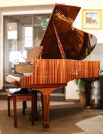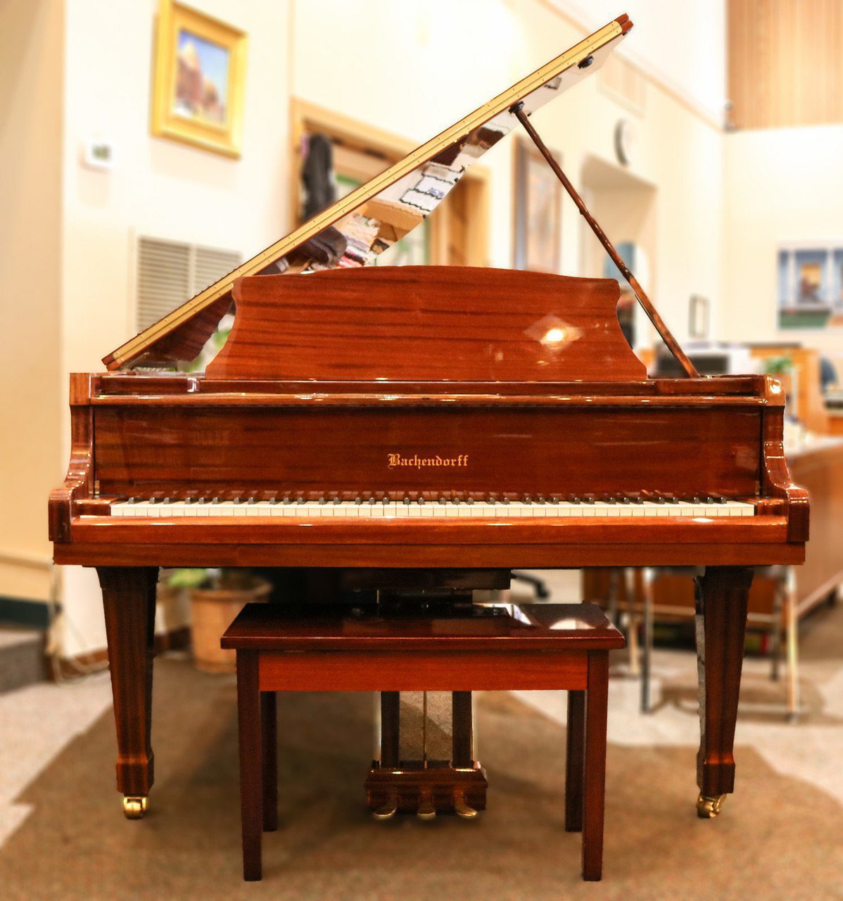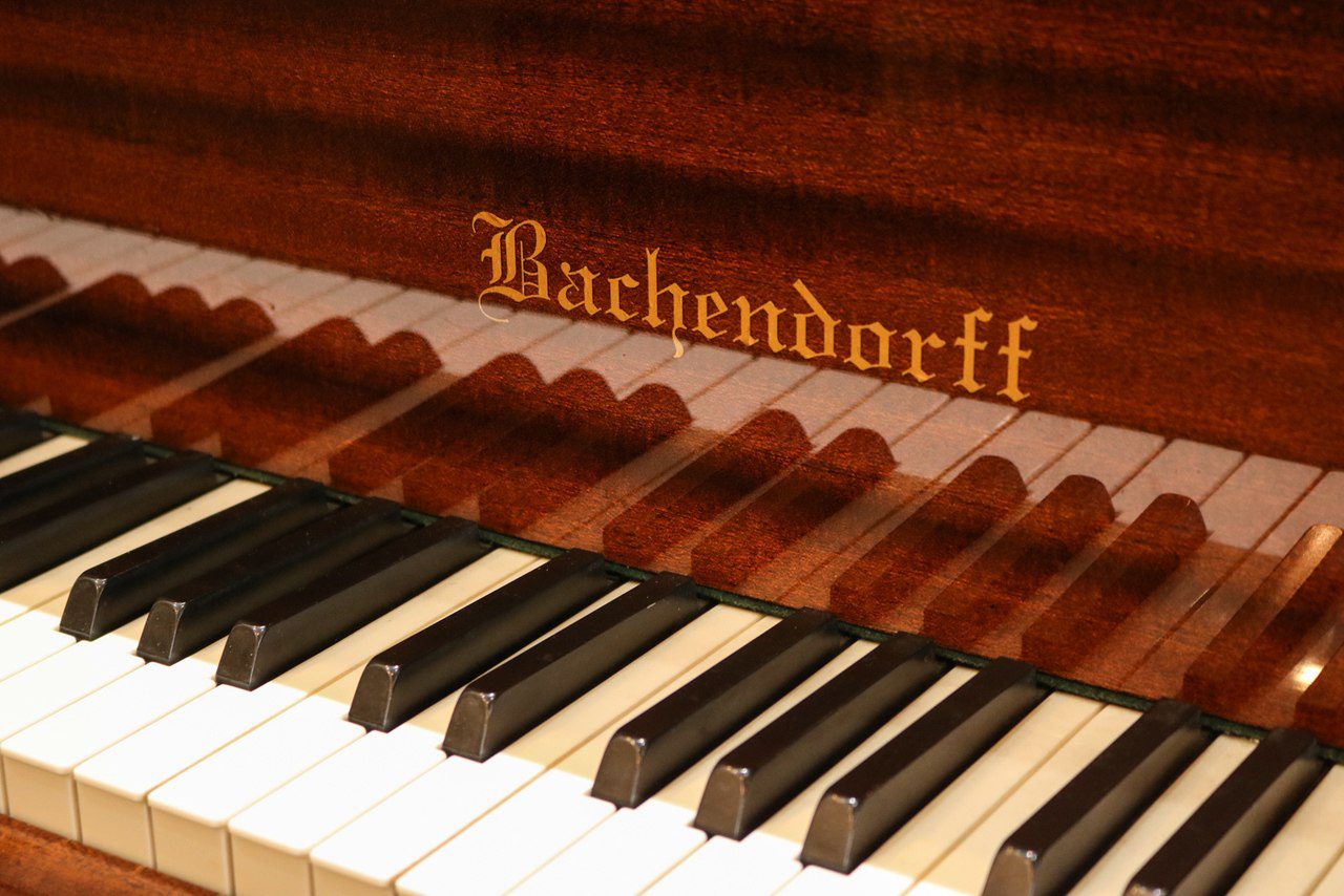 USED Bachendorff 6′ Grand Piano with matching bench in high polished Mahogany finish. Piano features an incredible tone and wide range of volume from booming bass to soft champagne glass highs in the treble end. The action is consistent from bottom to top; tone is warm rounded and beautiful; the overall timbre makes playing this piano a real treat. Designed as a highly attractive, great performing instrument, this piano is ideally situated for a position of high visibility: public lobby area, reception space, music venue, stage, lounge, bank lobby, music room, church, studio and living room. Comes complete with FREE local delivery and tuning.