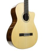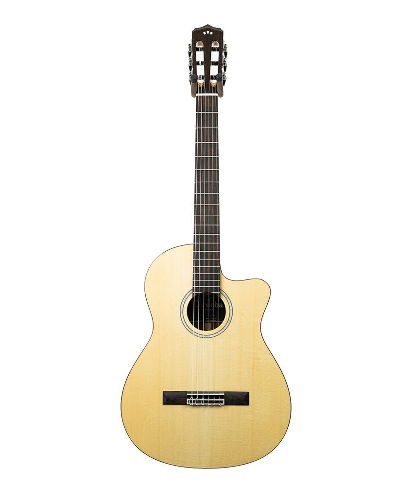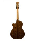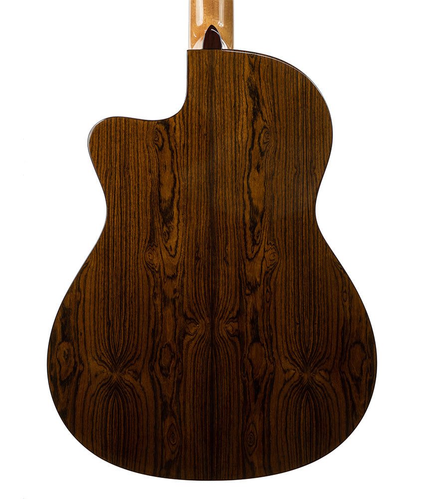 Cordoba’s Fusion 5 Limited Bocote Classical guitar is the perfect choice to transition from a steel string to a nylon guitar. Features exotic Bocote back and sides, a full body with cutaway for extended range, side dot fret position markers, and a pearl decal rosette and arches. The fusion neck with a 16″ radius fretboard and smaller, 1 7/8″ (48mm) nut width provides a playing experience very close to that of a steel string guitar. This familiarity offers an easy transition for steel string players and players with smaller hands to the world of nylon string guitar.