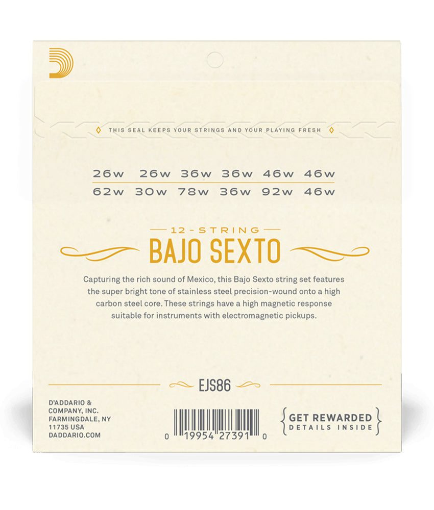 EJS86 is a stainless steel wound string set for Bajo Sexto, optimized for use with magnetic pickups. D’Addario’s portfolio of products designed specifically for World Instruments is based on research and product testing with instrument builders, educators, and professional musicians.