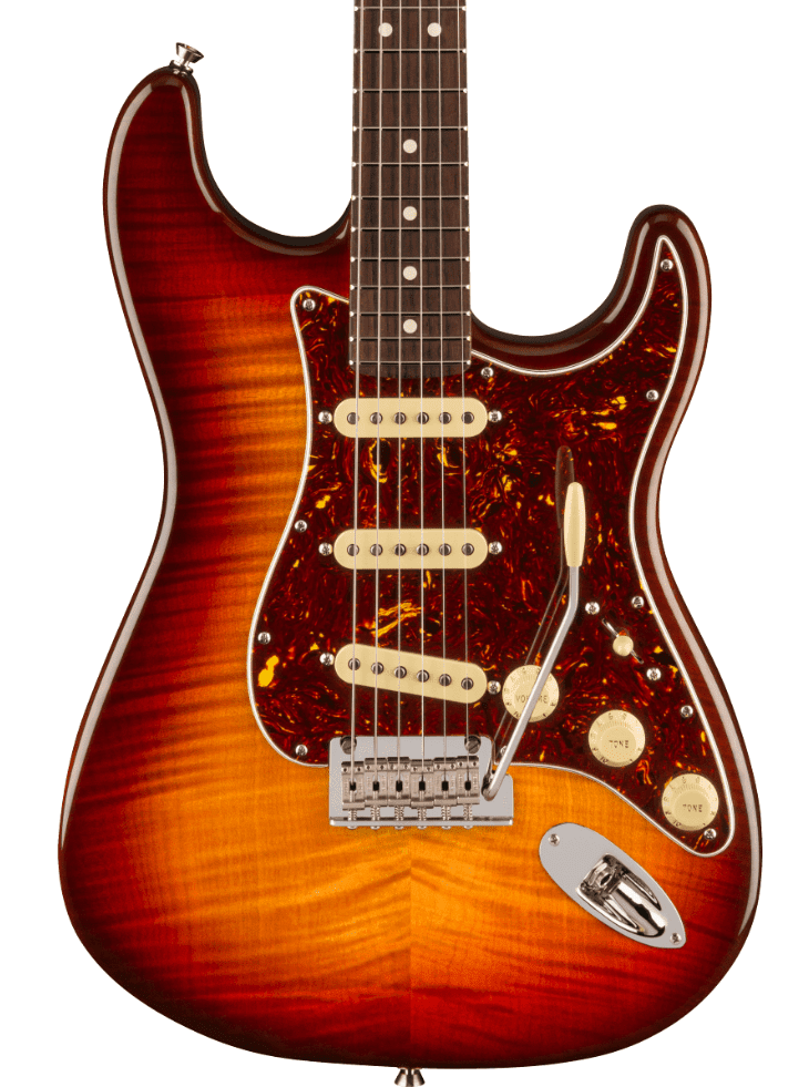 Take your playing to new heights with the 70th Anniversary American Professional II Stratocaster. The alder body, stunning flame maple top and Comet Burst finish exude elegance and class. Equipped with 70th Anniversary V-Mod II Single-Coil Strat pickups, this guitar delivers dynamic and expressive tones. The Deep “C” neck features smooth rolled fingerboard edges, “Super-Natural” satin finish and sculpted neck heel for a supremely comfortable feel and easy access to the upper register. An upgraded 2-point tremolo with a cold-rolled steel block increases sustain, clarity and high-end sparkle. Deluxe locking tuners ensure exceptional tuning stability.