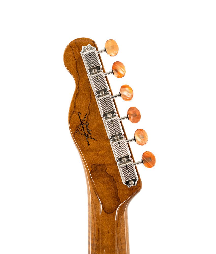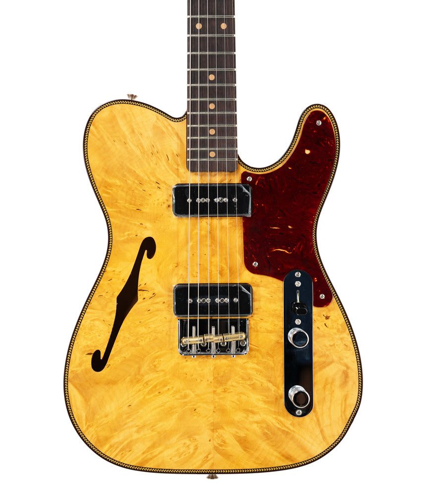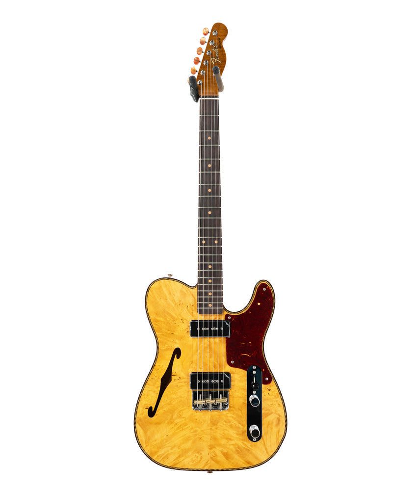 The Artisan Dual P90 Maple Burl Telecaster combines the finest hand-selected figured woods with a host of streamlined player-centric features and a set of Custom Shop P90s for an exceptional contemporary playing experience. The lightweight and resonant thinline vintage Kalamazoo body has a 4A maple burl top, while the roasted 3A flame maple neck features a ’60-style “oval C” profile; compound-radius (9.5″-12″) round-lam rosewood fingerboard, and 21 narrow tall (6105) frets for exceptional play along the entire length of the neck.