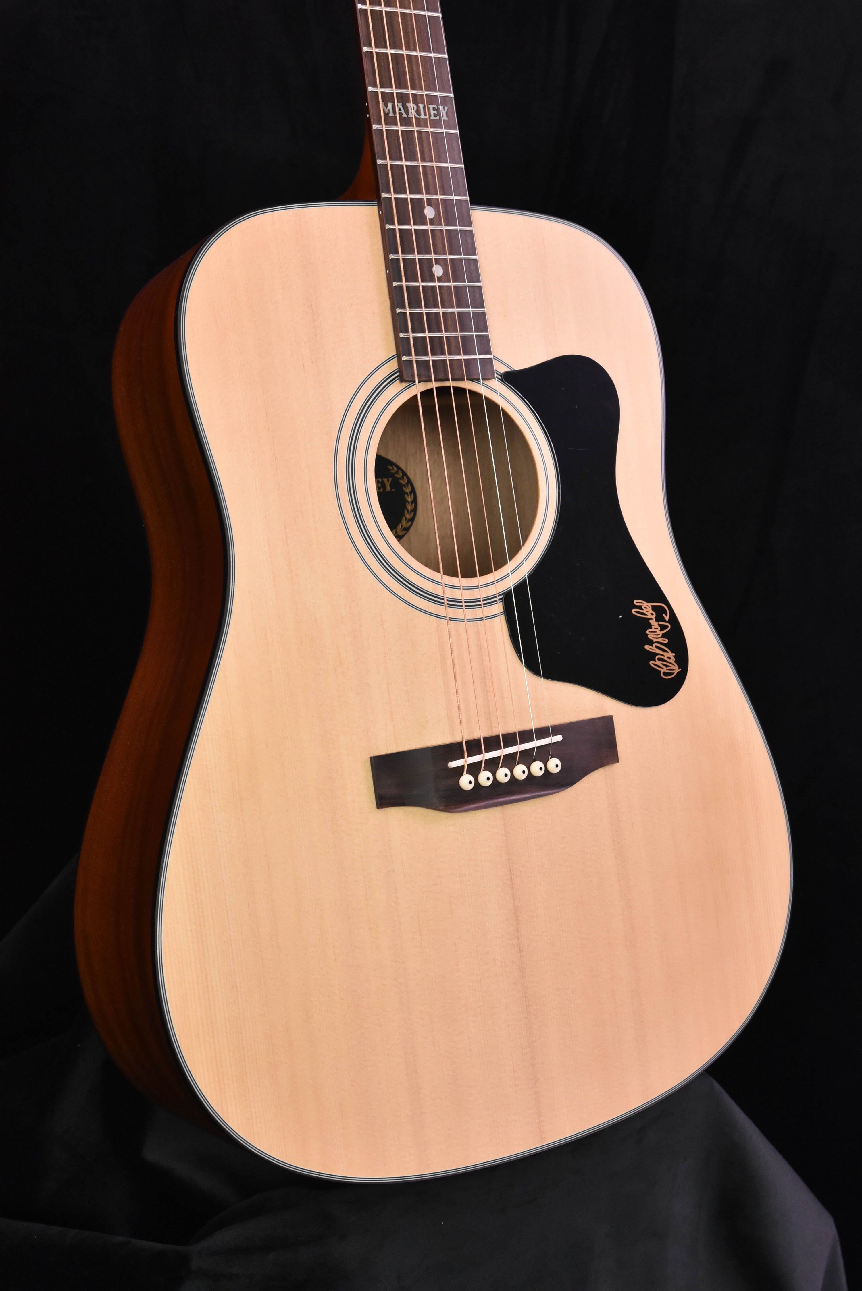 Based on Bob Marley’s at-home, songwriting guitar, the Guild A-20 Marley is a worthy tribute to the reggae legend. Many of Marley’s hits through the seventies were written on his Guild Madeira acoustic guitar. The A-20 Marley reintroduces Marley’s beloved dreadnought to the world along with a few modern appointments. Built with a solid spruce top and mahogany back and sides, the full-bodied and powerful tone of this dreadnought provides Marley fans and songwriters alike with an easy-to-play, well-balanced acoustic guitar. The C-shaped neck with 25 ½” scale length allows for a relaxed and comfortable feel. Unique features include a vintage-correct, flat, round-cornered headstock with vintage Guild script logo, custom pickguard with Bob Marley signature, and a MARLEY script inlay on the 12th fret. Additional features include a pau ferro fingerboard and bridge, bone nut and saddle, and a matte polyurethane finish. Available in Natural. As a continuation of Bob Marley’s love for music and planet, the guitar includes a premium Marley X Guild gig bag made from recycled nylon. Additionally, Guild has partnered with One Tree Planted to plant a tree for every Marley guitar made. The included booklet contains the history of Marley’s Guild Madeira, first-hand stories from his family, details on how the A-20 Marley was made, and official chords for one of Bob Marley’s biggest hits. Three custom guitar picks display a lion and Guild G-Shield in gold ink. Finally, an exclusive poster featuring Bob Marley and his original Guild is included to commemorate the legacy of one of the world’s greatest songwriters.