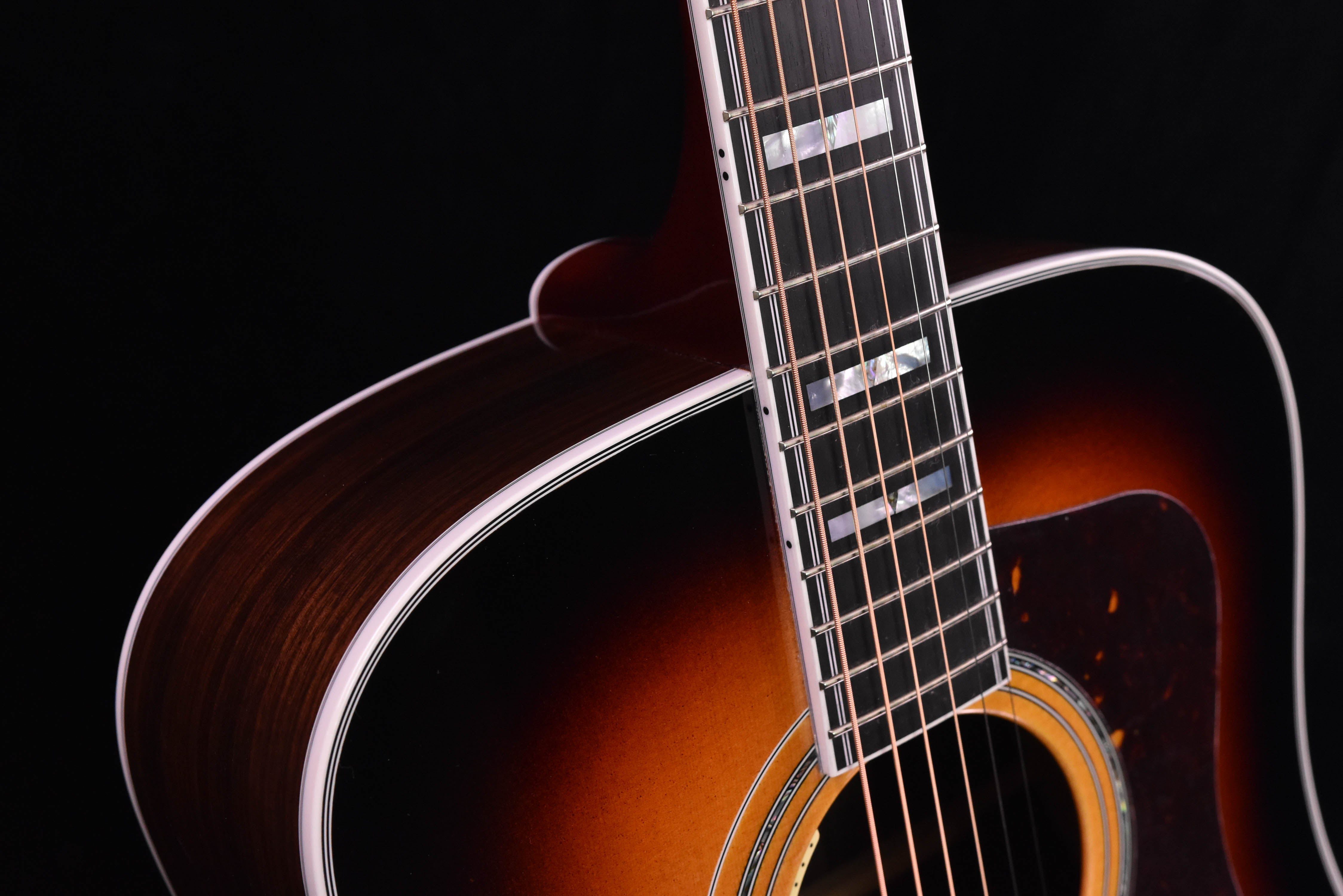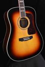 This dreadnought features high-quality tonewoods such as a solid AAA spruce top with scalloped red spruce bracing and solid rosewood sides and back. The Antique Burst paint job and nitrocellulose lacquer finish combine to make a stunning looking guitar as well as a brilliantly resonant body. The mahogany neck features a bound ebony fretboard with a 12″ radius and natural mother of pearl and abalone inlays. The nut width is 1.69″. Other fine appointments on this D-55 include gold hardware, an ebony bridge, abalone rosette, Gotoh 700 series open back tuners, bone saddle and nut and a tortoise shell pickguard. This D-55 comes with a premium hard shell case.The LR Baggs Anthem pickup system is crystal clear and transparent. You get the accurate and true sound of this awesome guitar seeping through your amp or PA system.