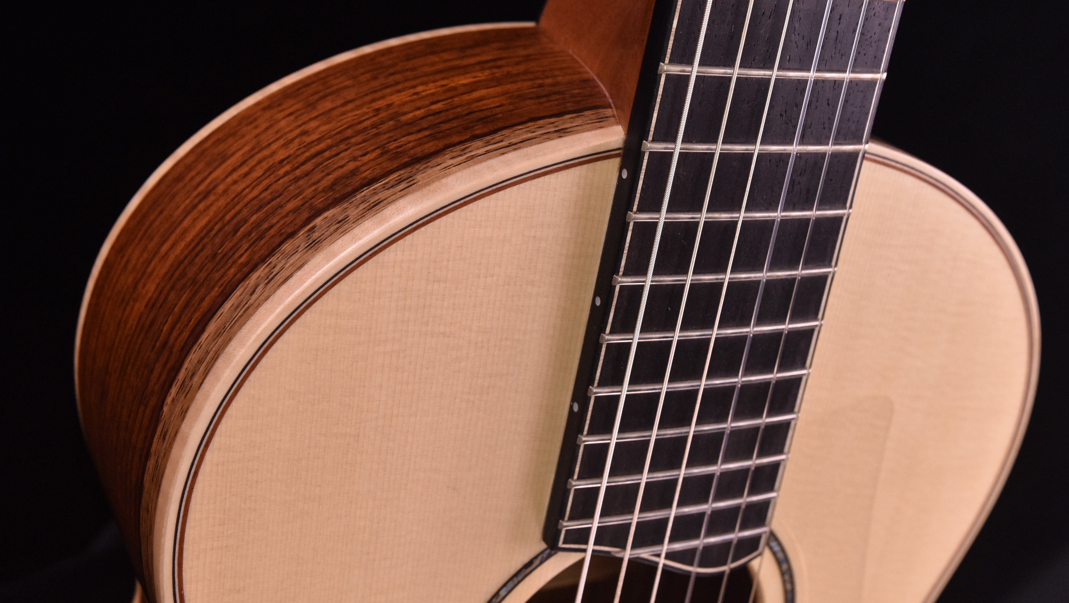 “I designed the Jazz series with nylon strings and an internal pick up fitted as standard so that it would feel very comfortable for classical and steel string players alike. The neck has enough width to facilitate the nylon strings but at the same time the cambered fingerboard allows for a wide variety of playing styles. Voiced for a really great acoustic response, and at the same time stiff enough for loud volume to be possible without the whole guitar over-reacting when played loud through a sound system. The tone is very natural and full with none of the over bright tones sometimes found on too lightly built classicals. I re-designed these models in 2003 to improve the acoustic voice. The Jazz is also fitted with a Fishman Matrix Infinity pickup as standard.”