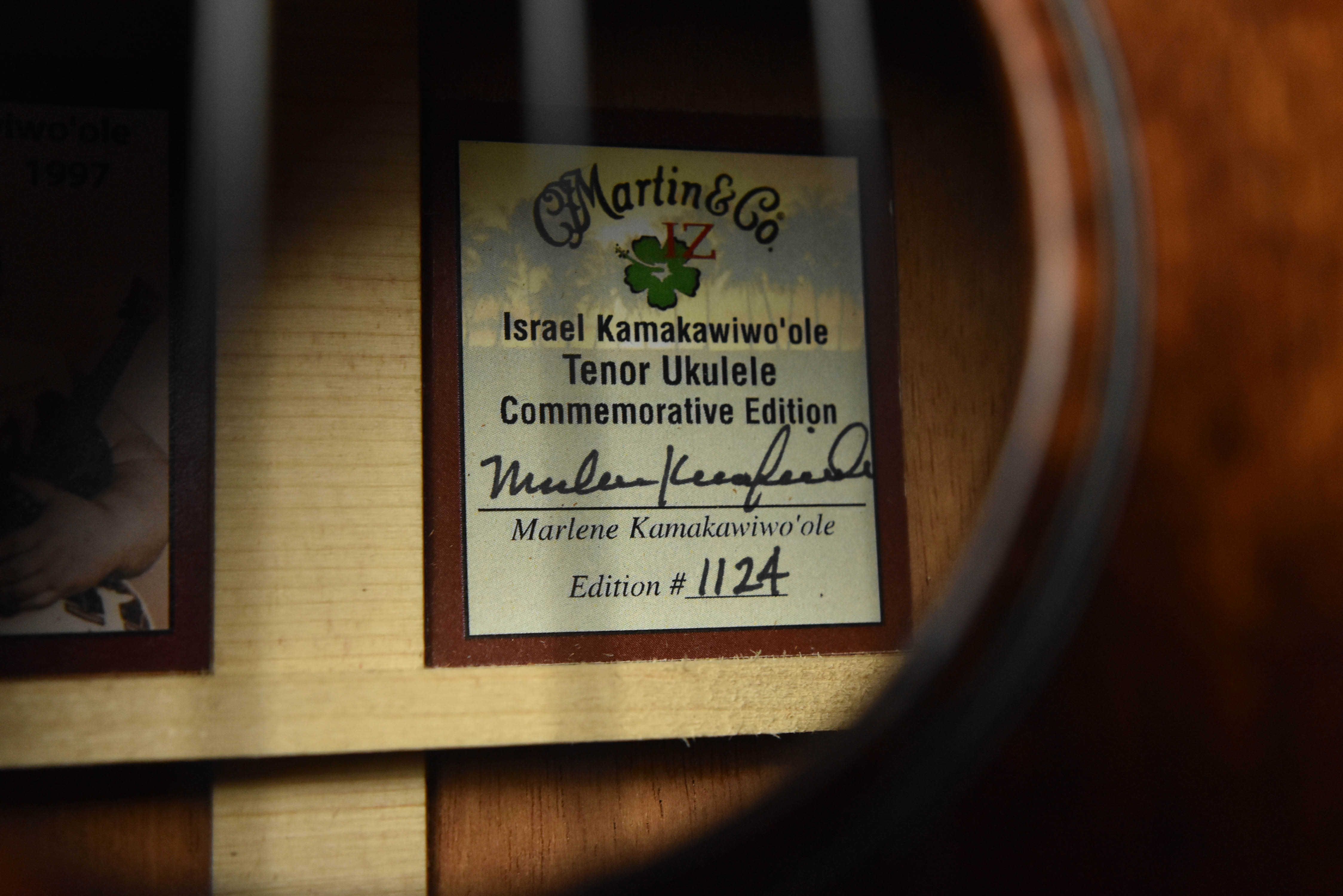 A tribute to legendary artist Israel Kamakawiwo’ole (“Iz”), this Martin 1T IZ tenor ukulele features beautiful genuine quilted mahogany construction, an East Indian rosewood headplate adorned with “IZ” inlaid in Hawaiian Koa, and a hibiscus flower inlaid in pink awabi pearl.