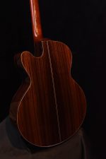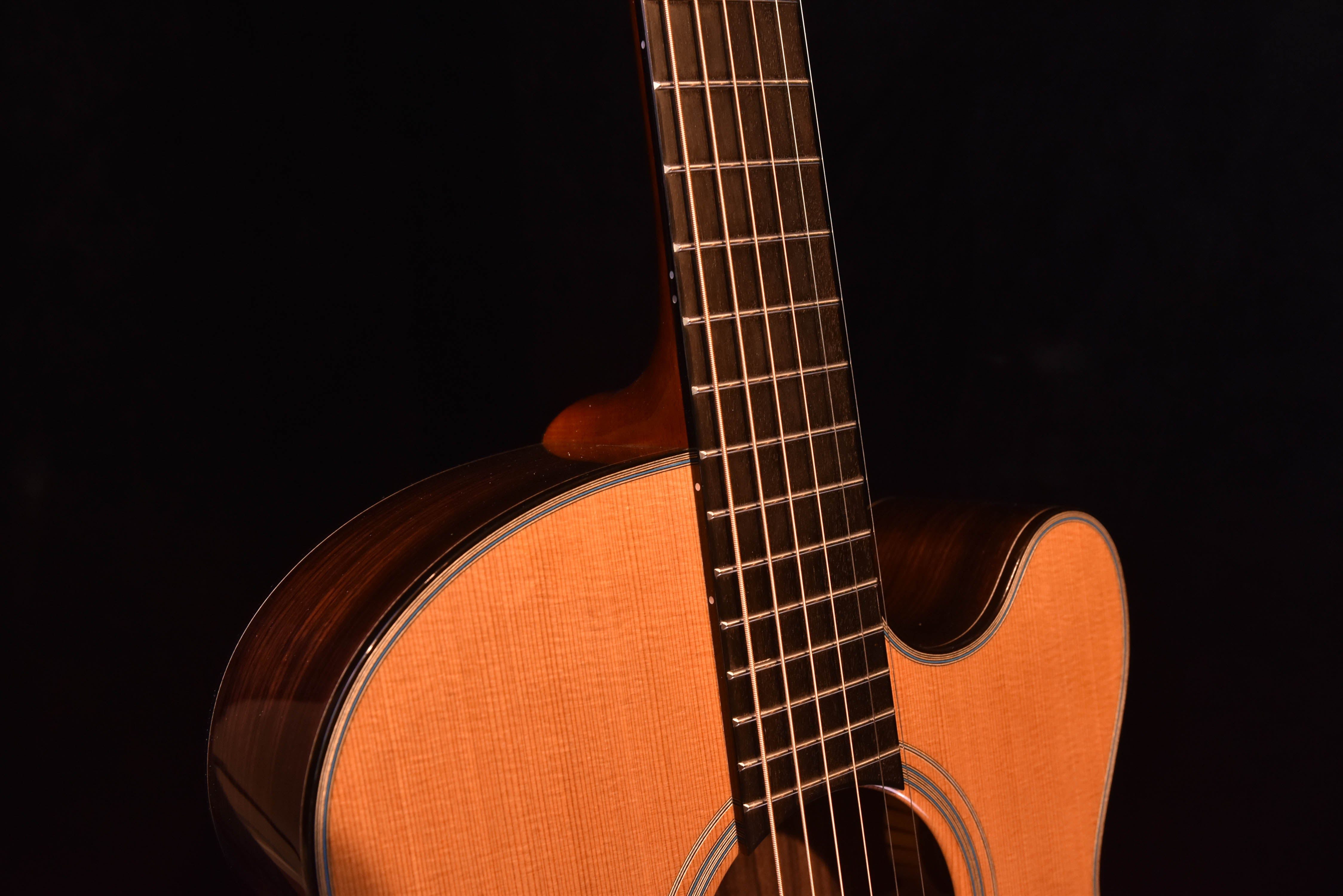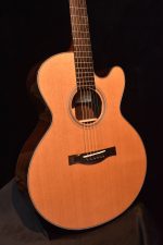 The FS Model was designed in response to the renaissance of alternate tunings for complex fingerstyle arrangements. Tacoma and Windham Hill labels provided the showcase for these new and sophisticated steel string explorers who were attempting to express themselves on booming dreadnoughts. Will Ackerman, Robbie Basho, Daniel Hecht, Duck Baker and Michael Hedges all looked to SCGC for the teams’ expertise in achieving custom tone to make an instrument with the perfect voice for this new style. With input from the pros, the tiny SCGC team at the time, which included Jeff Traugott, Michael Hornick and Steve Palazzo, stepped up to the challenge with this concept: design and build a specialty fingerstyle instrument that responds with immediacy and volume to the minimized energy imparted from fingertips and the reduced tension of many open tunings. Give it a contemporary aesthetic of simple elegance and complexity of tone that the player can not outgrow. Twenty-five years and numerous awards and accolades later, The Fretboard Journal credits the Santa Cruz FS as the inspiration for the guitar designs of some of the brightest lights in contemporary lutherie and a strong influence on major manufacturers. The FS is a truly sophisticated instrument that will allow the best possible presentation of your fingerstyle technique.