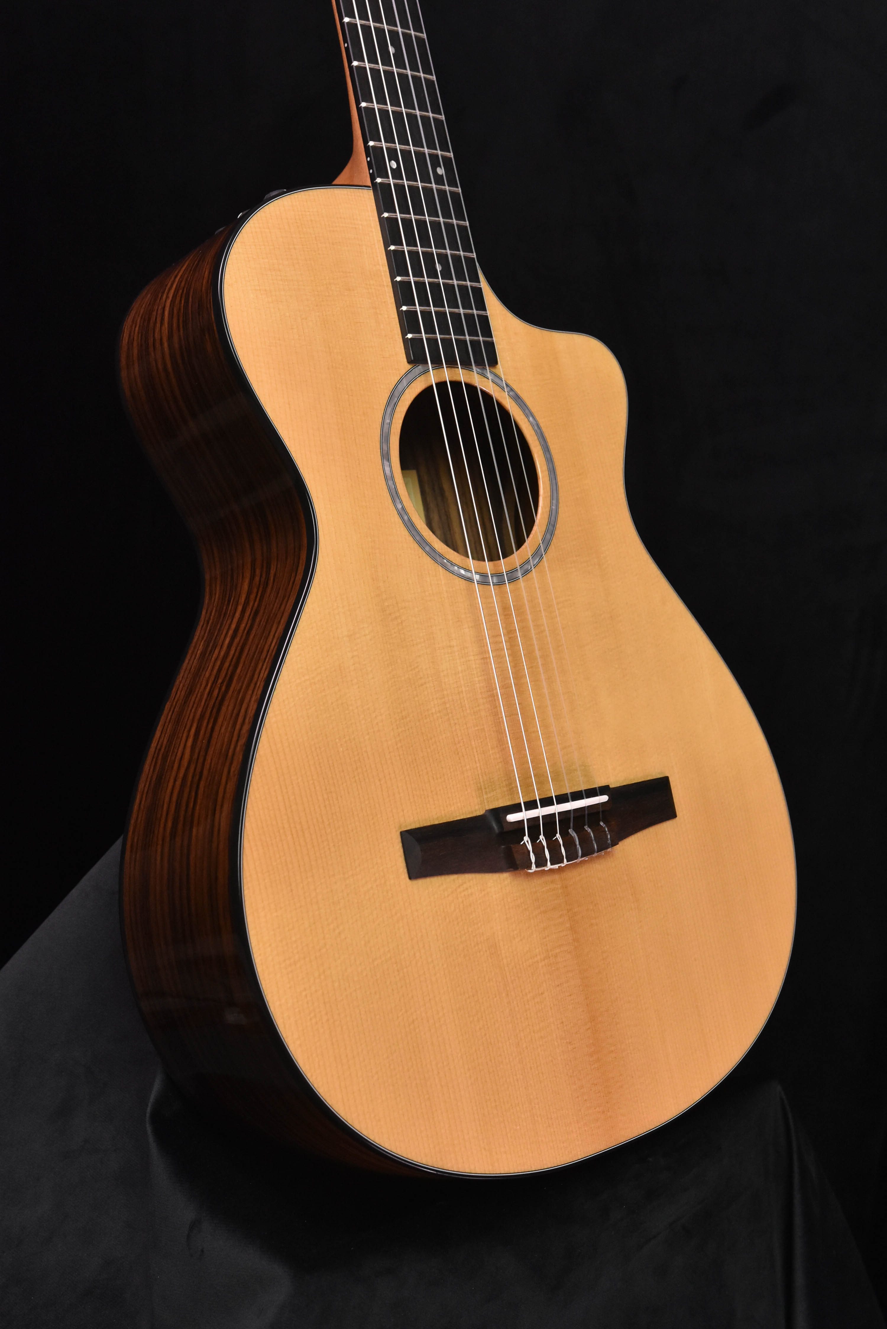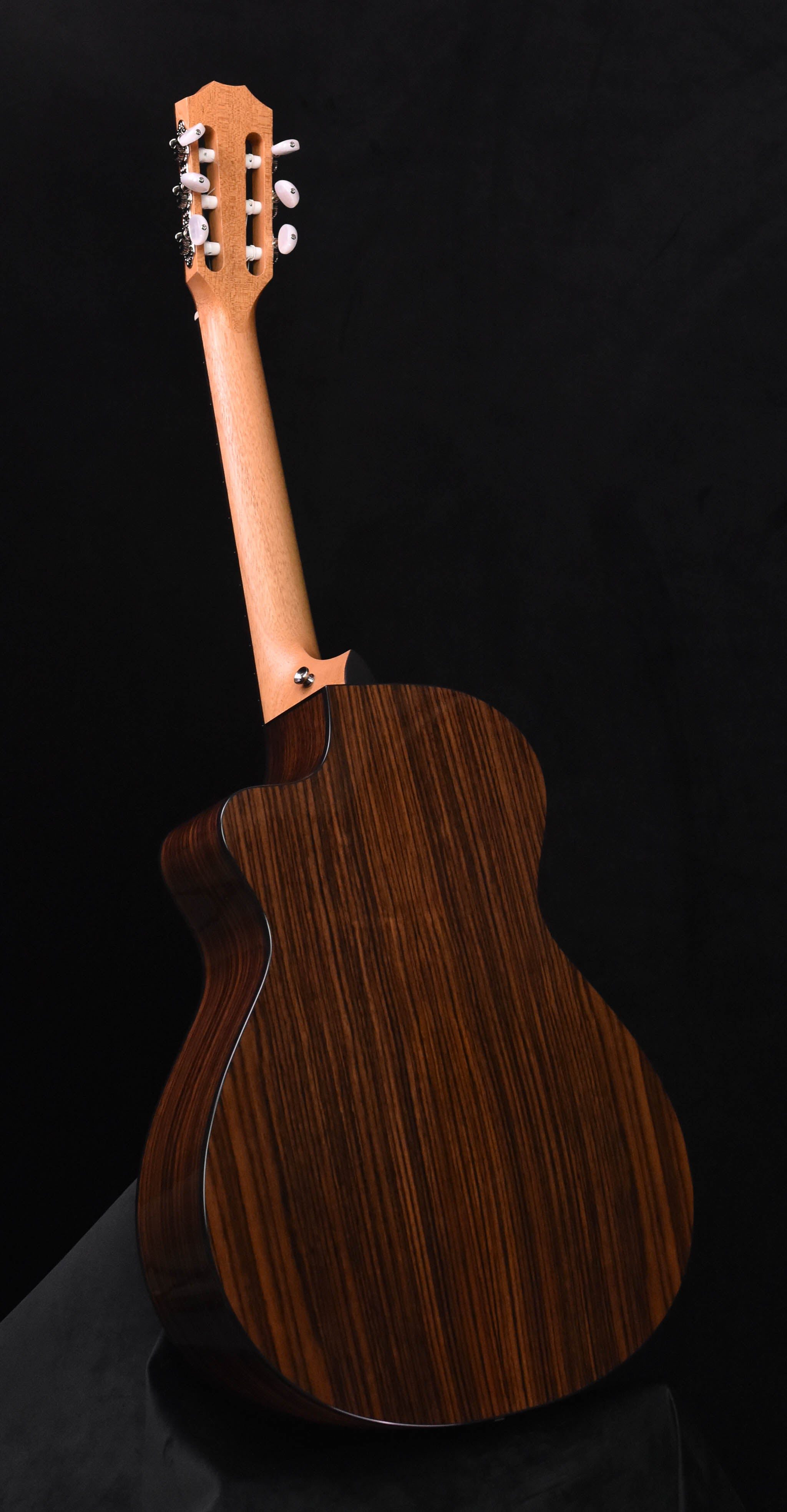 Blending inspiring nylon-string tonal flavors with smooth playability, the 212ce-N Plus is a professional-level instrument that comes at an appealing price. Thanks to a 12-fret neck, slightly wider 1-7/8-inch nut width and slender Taylor neck, this cutaway Grand Concert is one of the most playable nylon-string guitars on the market. Pairing a solid torrefied spruce top with layered sapele back and sides yields an articulate, snappy sound that classical and steel-string players will find inspiring. Our roasting process for the soundboard adds a splash of played-in sweetness right out of the box. Specialized interior bracing ensures a clear, open voice that’s responsive to a light touch and long on sustain. An onboard ES-N pickup produces a natural, authentic nylon-string sound in amplified settings. This Plus model boasts a gloss-finished body with black binding, a slotted peghead, an Italian acrylic rosette, 4mm dot fretboard inlays and classical nickel tuners with faux pearl buttons. It ships in a lightweight, durable AeroCase.