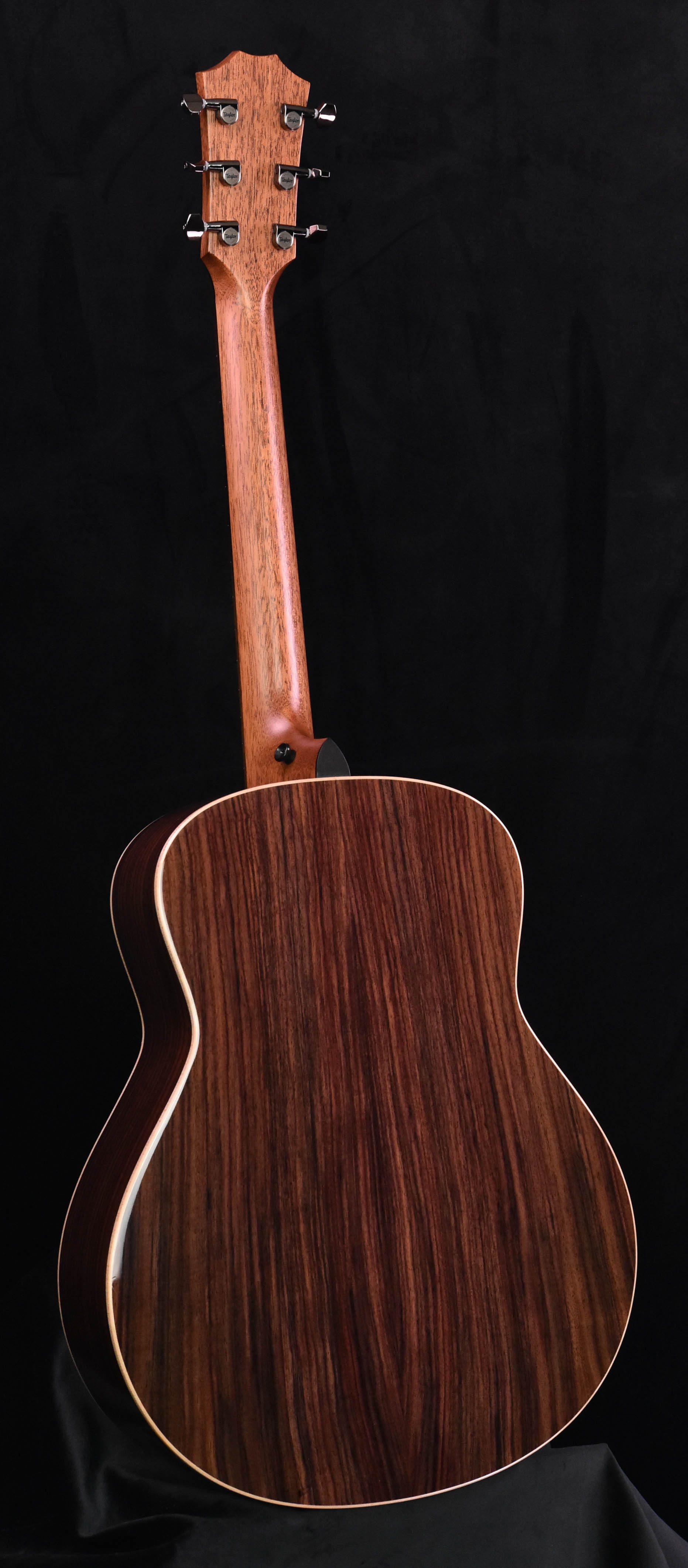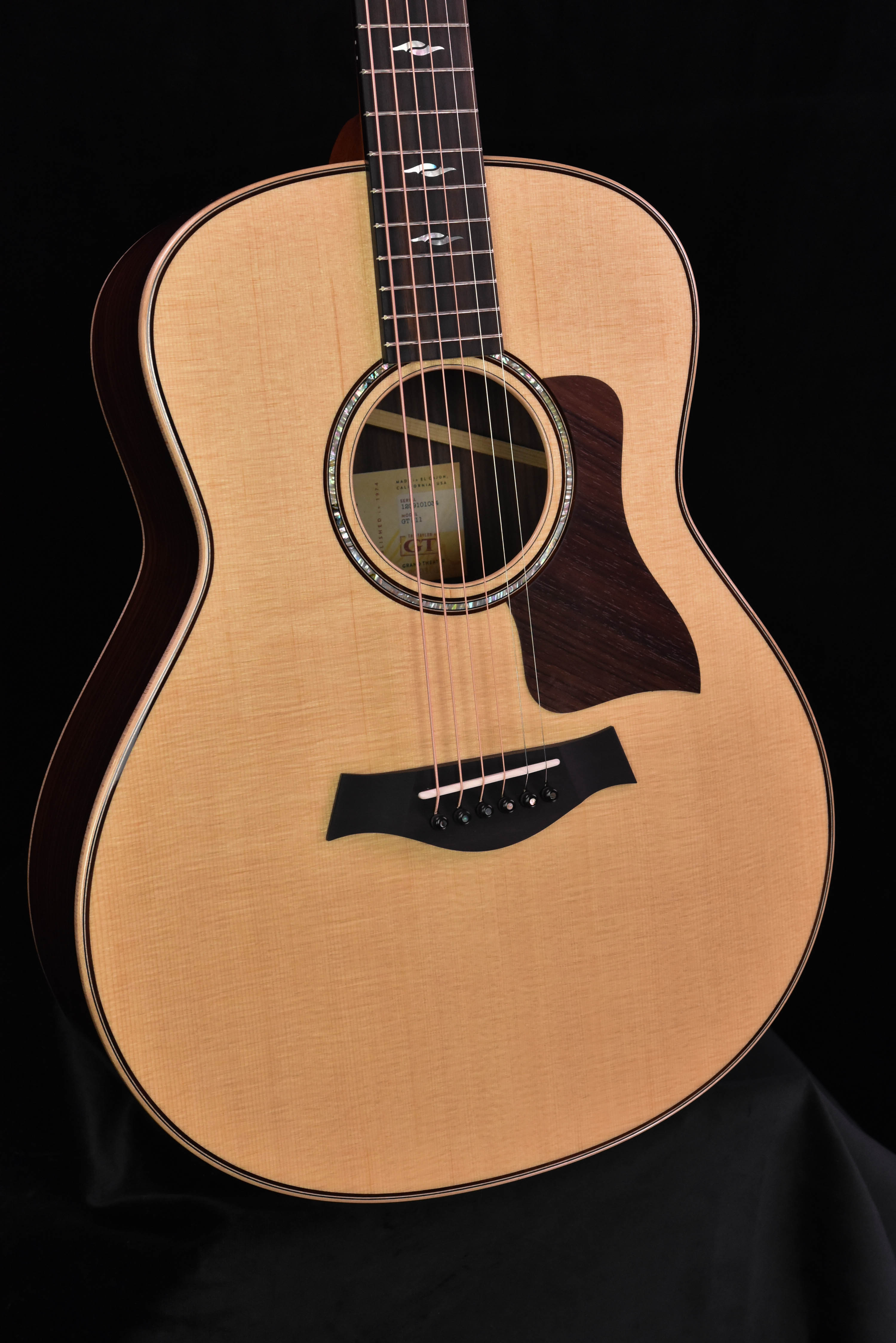 One of the first GT guitars to be released in the context of an existing series, the GT 811 blends the dazzling sparkle and warmth of Indian rosewood with the unmatched playability of the GT’s comfortably compact frame. With its shorter body and scale length, the GT’s proportions are smaller than the Grand Concert but larger than the GS Mini, finding a sweet spot where comfort meets rich, solid-wood tone. The superstar tonewood pairing of Indian rosewood back and sides with a Sitka spruce top delivers all the clarity and balance you’d expect from a full-size rosewood guitar, while its smaller footprint and shorter scale (24-⅛”) provide a slinkier feel that makes complex chords or arpeggio formations easier to hold. Under the hood, the GT 811 reflects Taylor’s envelope-pushing design approach—we’ve adapted the tone-enhancing benefits of V-Class bracing into a new pattern that provides similar increases in volume and sustain for the GT’s smaller frame. Called C-Class bracing, this interior architecture boosts the response in the bass range, yielding warmth and presence that a guitar of this size typically can’t produce. This model is appointed to match its counterparts in the 800 Series, featuring maple binding with black purfling accents, a single-ring abalone rosette, a thin 4.5-mil gloss finish on the entire body, and mother-of-pearl fretboard and peghead inlays in our Element pattern. The GT 811 ships with Taylor’s exclusive AeroCase, whose ultra-lightweight construction and padded walls provides ample protection.
