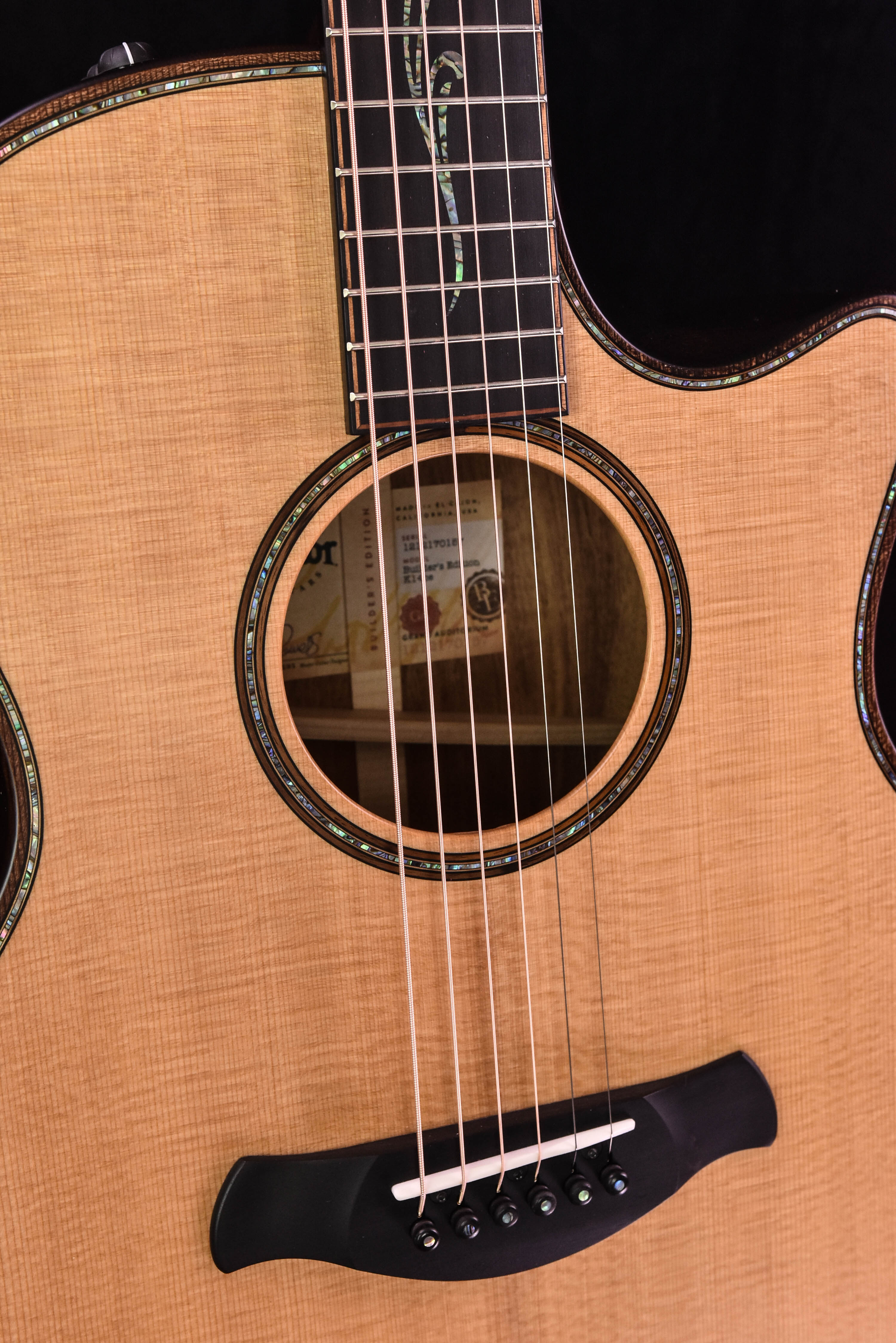 Another design emphasis of Builder’s Edition is enhanced playing comfort in the form of ergonomic new body contours. Details include a beveled armrest, beveled body edge treatment, and a reshaped cutaway that flows smoothly into the heel and incorporates a finger bevel where the cutaway meets the soundboard. This creates a more fluid path to the guitar’s upper-register notes for your fretting hand.