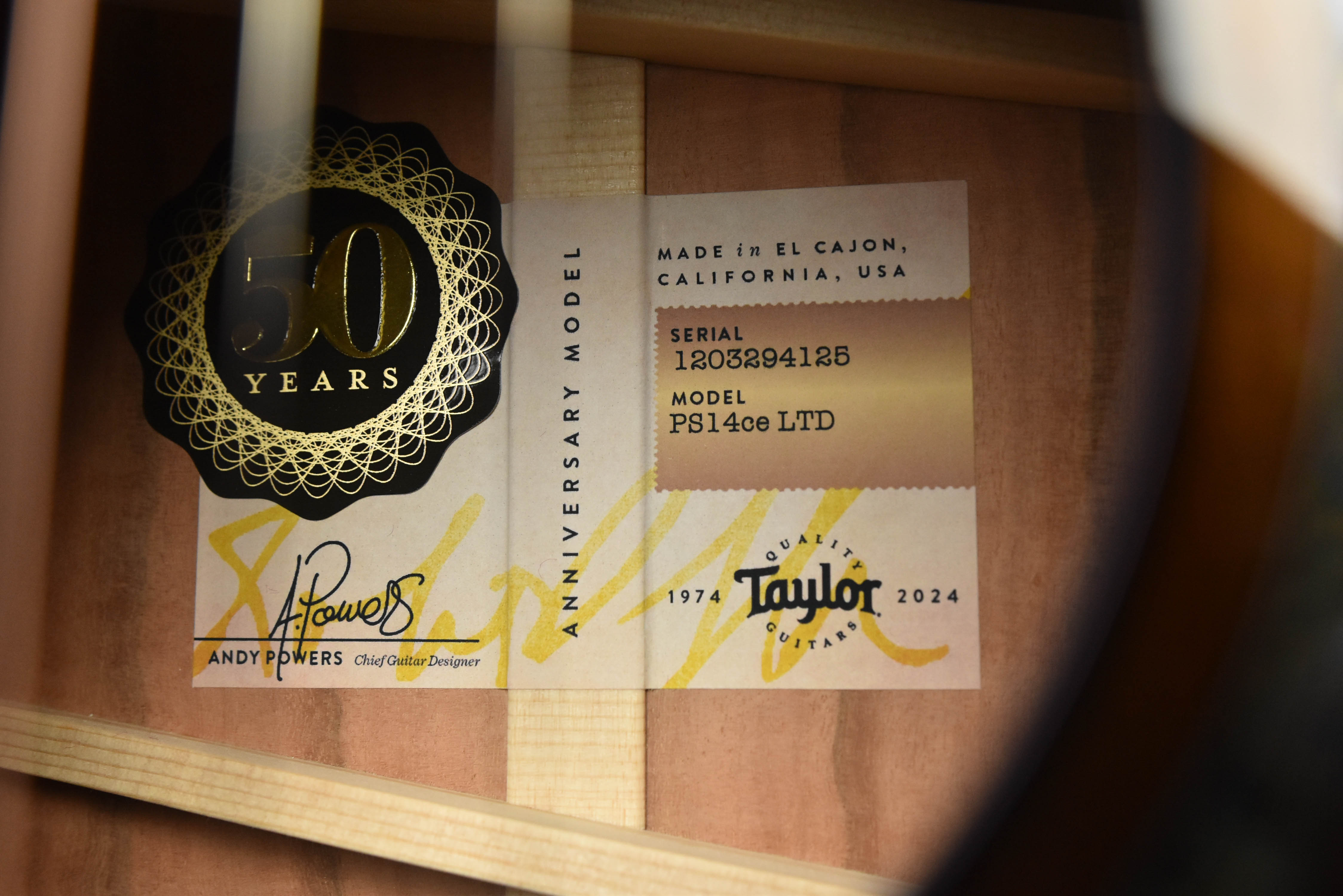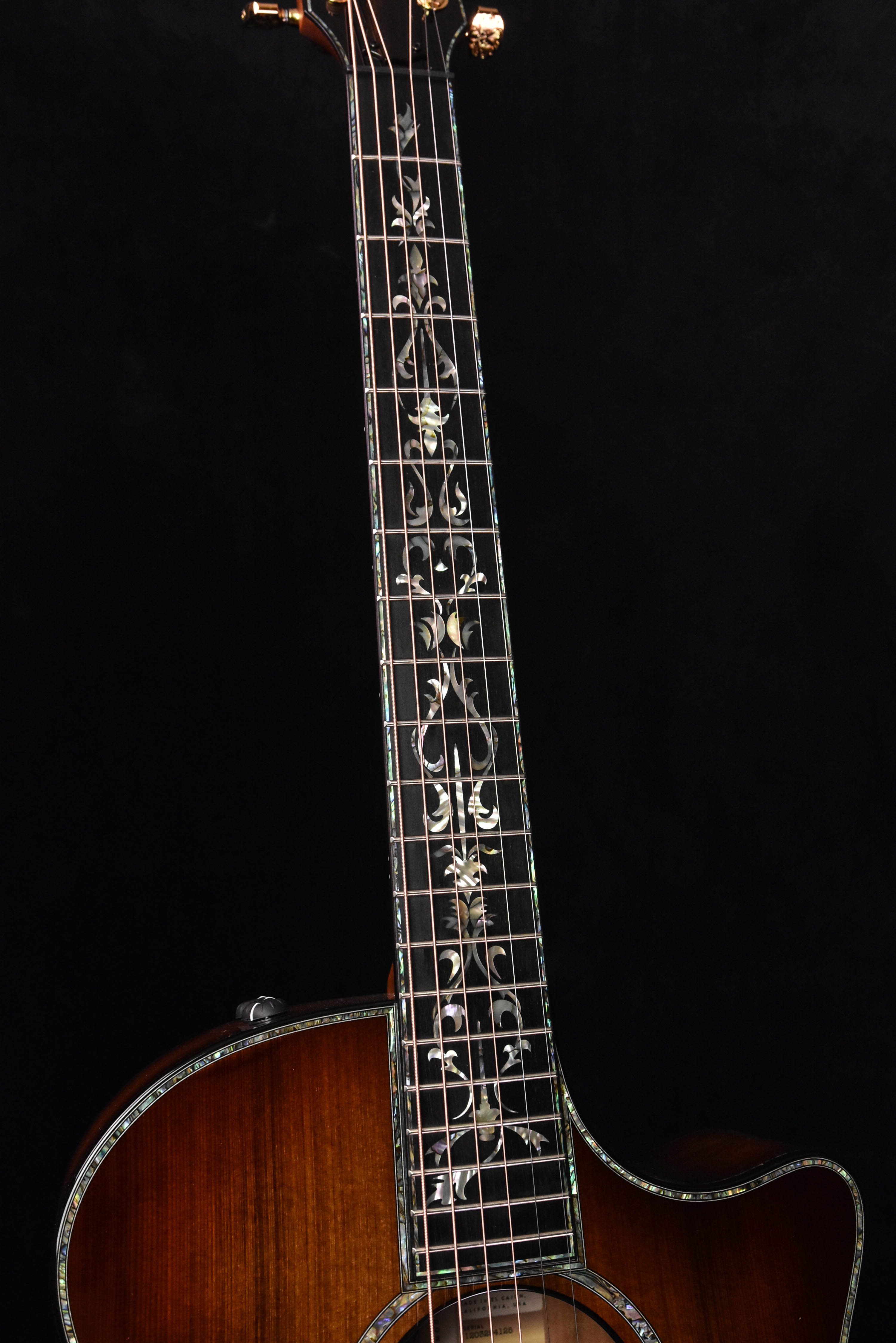 Introduced in 1996, Taylor’s Presentation Series showcases their finest tonewoods, visual artistry and meticulous craftsmanship. This 50th Anniversary PS14ce LTD is crafted with back and sides of figured Urban Ironbark with a beautifully striped sinker redwood top, all finished with an elegant shaded edgeburst. Sourced through their urban woods initiative, Urban Ironbark delivers a punchy, balanced response with piano-like fidelity to complement the power and cedar-like warmth of the sinker redwood top. Inside, our V-Class bracing dials up the volume and draws out more sustain for a truly robust musical character. Exclusive appointments for this limited-edition model include our Byzantine inlay suite in green abalone for the fretboard, peghead and bridge, a design featured on original Presentation Series guitars. It also sports paua edge trim with a matching rosette, Gotoh luxury gold tuning machines, and ebony bridge pins with gold acrylic dots. It ships with ES2 electronics, a built-in TaylorSense guitar health monitor and a deluxe hardshell case.