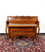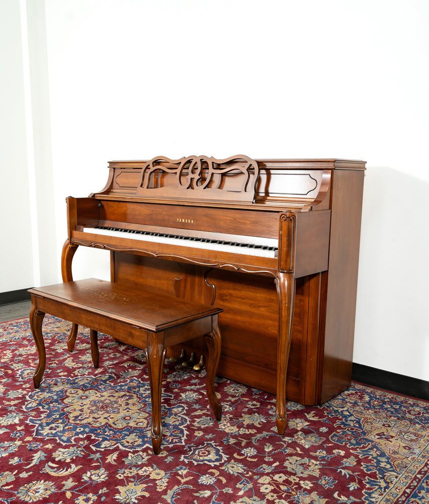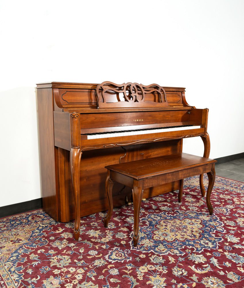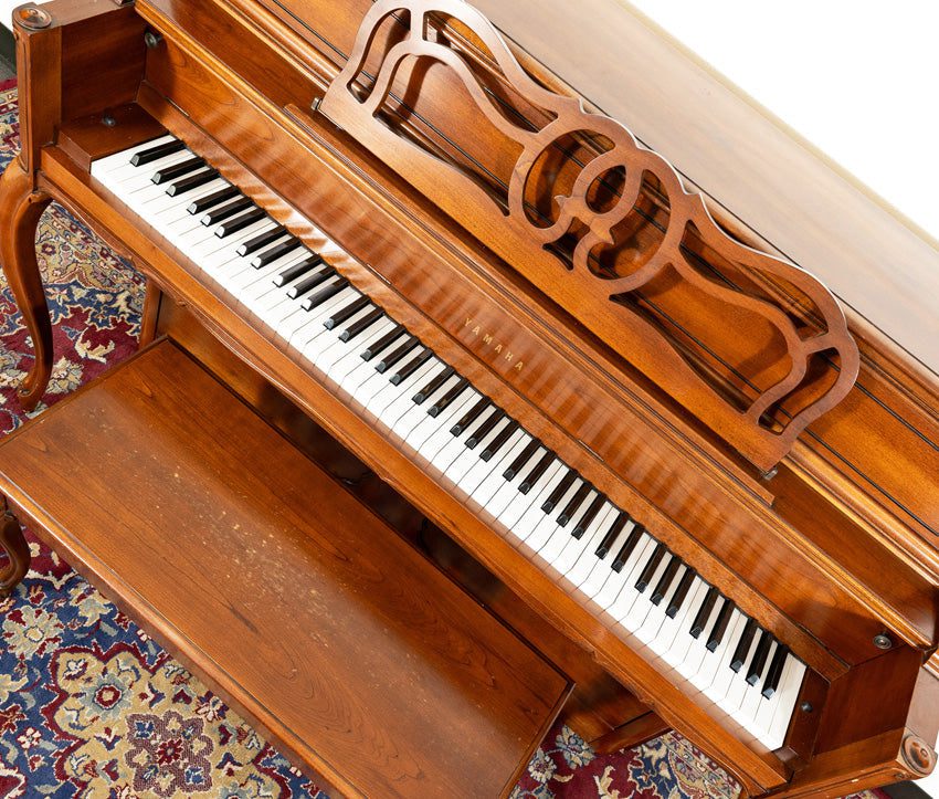 What more could you want from this Yamaha M215 console piano? A gorgeous cherry French Provincial cabinet with curvy legs, cutout music rack and matching duet bench qualifies this pre-owned Yamaha piano to be a centerpiece in your home. Add to that a lively, crisp tone and smooth action and you now have an instrument that is perfect for learning, teaching and everything in between.
